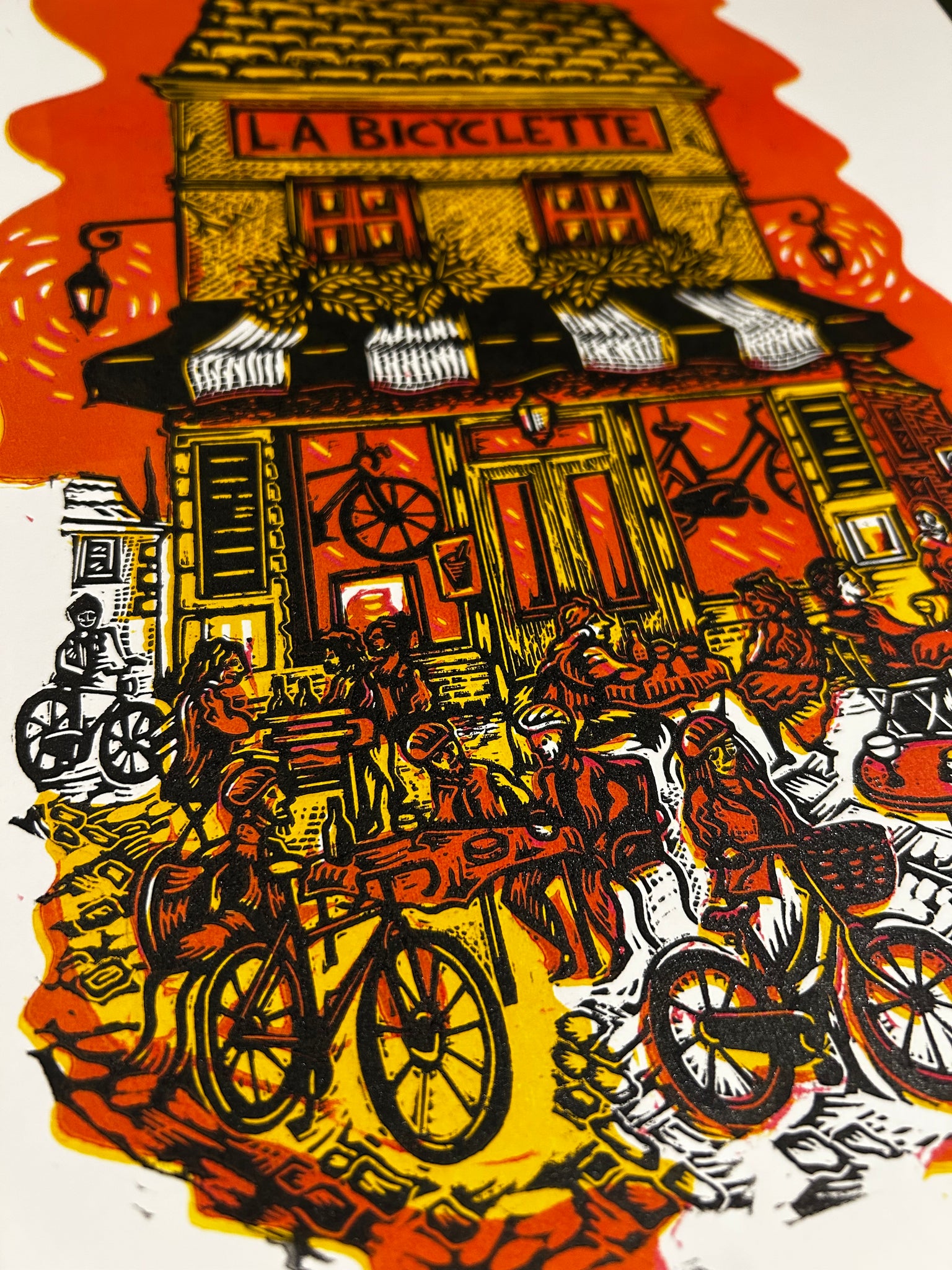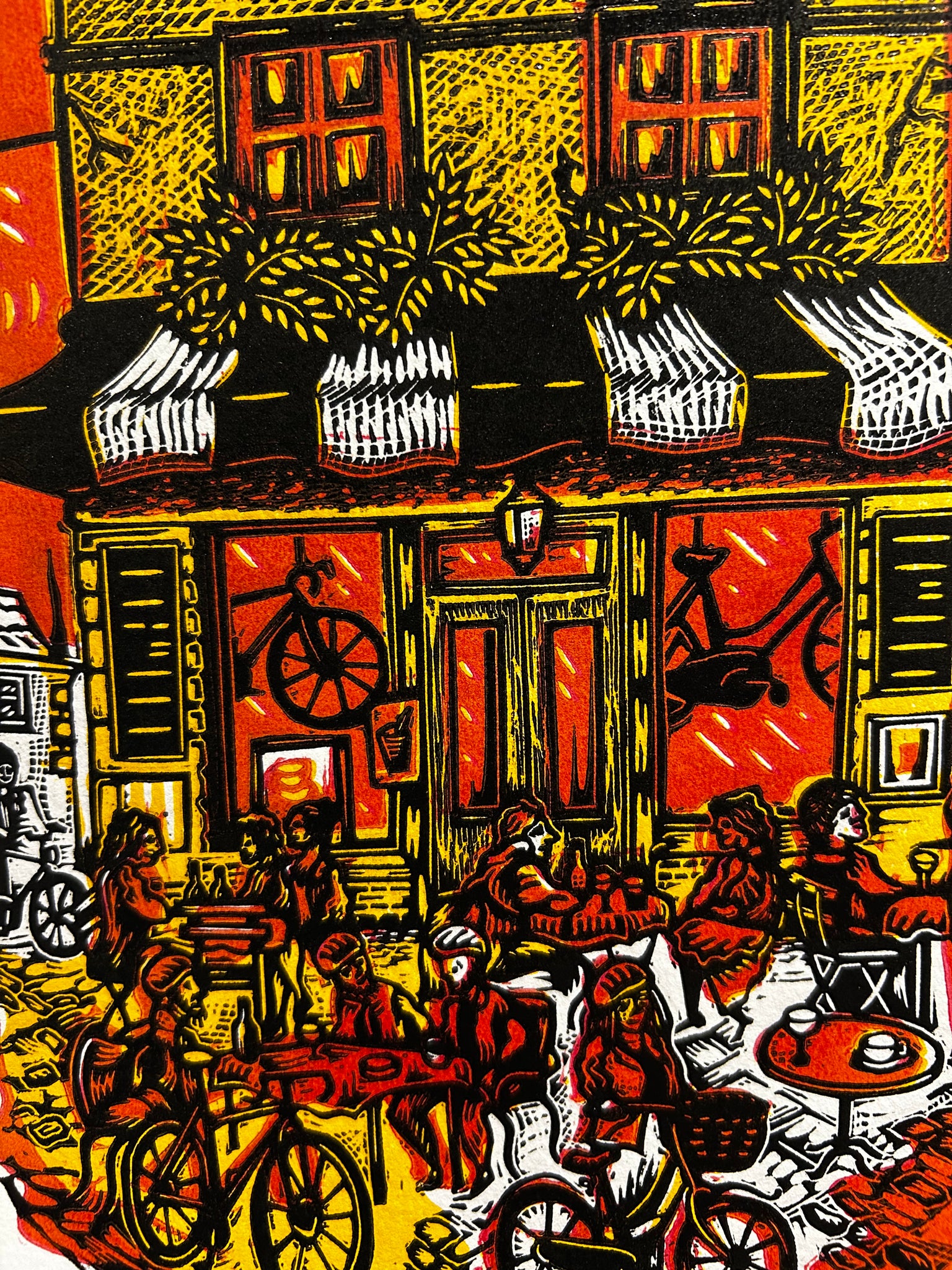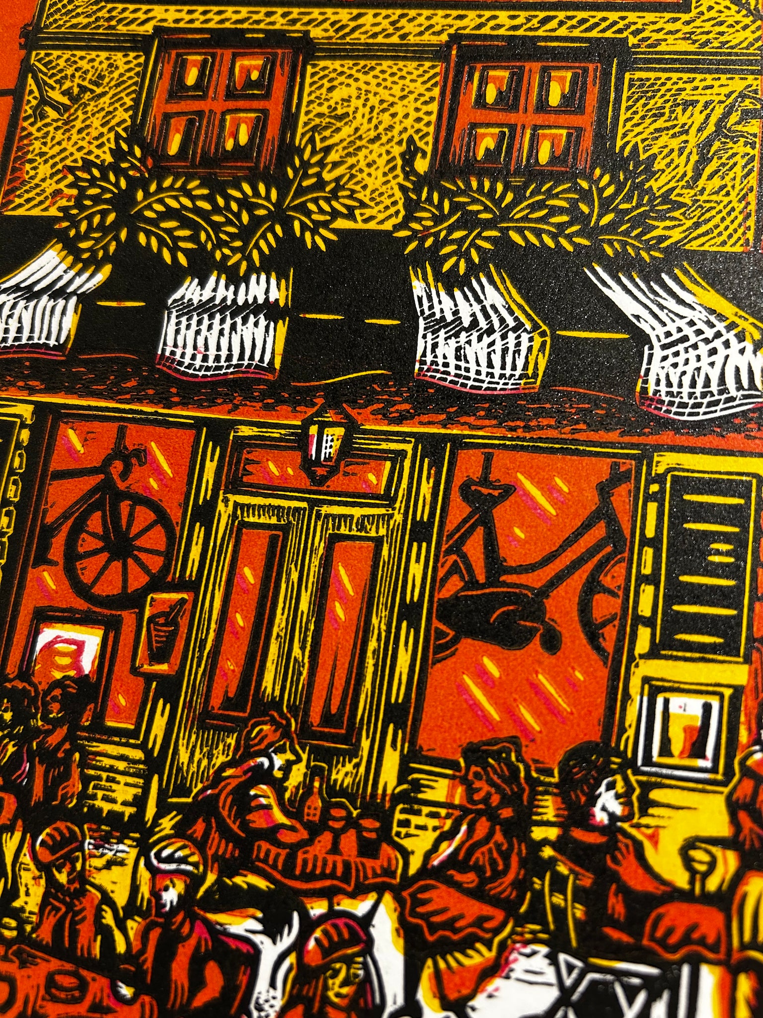 This piece has been created as a multi block reduction linocut all carved by hand and also has printed using eco friendly inks (no nasty chemicals) on a beautiful etching press.